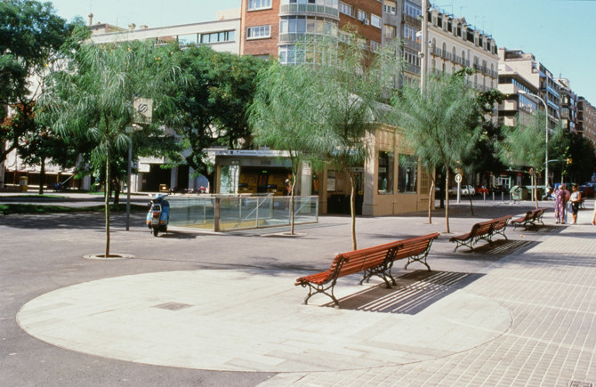- El mobiliario urbano es de serie, habitual en Barcelona. La obra ha sufrido modificaciones en 2010, debido a cambios en los accesos y vestíbulo subterráneo del metro.