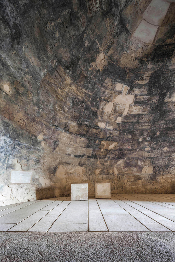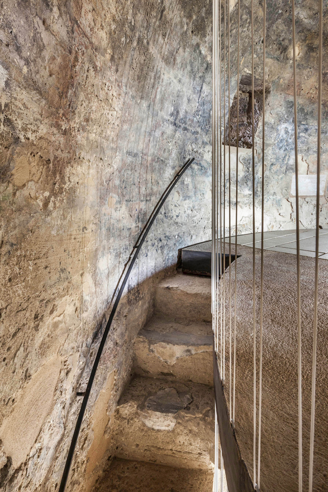 Para las carpinterías y otros elementos de protección que no existían en el momento de la construcción original, se han utilizado otros materiales como el acero corten que se han colocado en obra en seco para enfatizar aún más su carácter contemporáneo y probablemente efímero. En la plataforma de cubierta se eliminaron los arbustos y demás vegetación que comprometían la estanqueidad de la cubierta. También en este nivel se ha querido manifestar la huella de la antigua garita que protegía el acceso a cubierta y desde la cual se hacía uso del matacán.