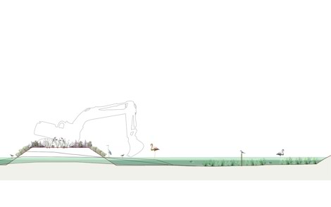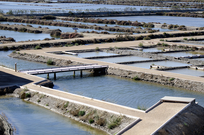Los diferentes requisitos en términos de profundidad, aislamiento y pendientes, hicieron que la sección de los diques de tierra entre las piscinas se remodelaran para diversificar la cantidad de inundaciones y crear así un archipiélago de islas entre la marea. Una construcción de un paisaje como un ecosistema artificial performativo, que propone formas coreográficas para ser recorridas, dentro de una narrativa que invita a explorar las lagunas intermareales, campos de sales y cristalizaciones, flamencos, charranes...