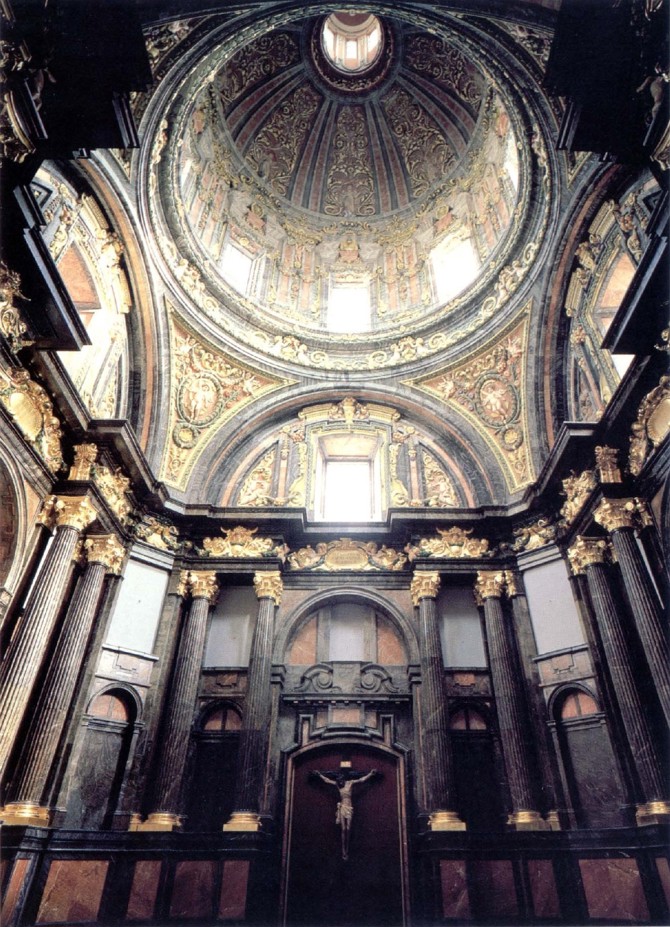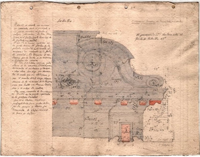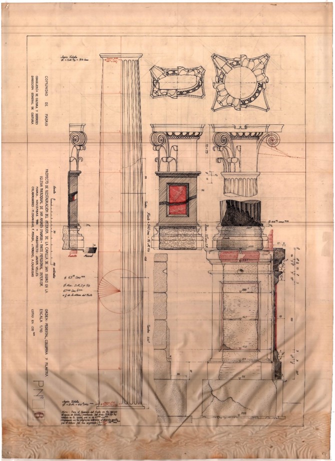 En el interior, en el cuerpo inferior, sobre los muros, permanecían adheridos algunos restos ennegrecidos de los mármoles que habían formado parte del basamento, las portadas, las ochavas, las pilastras y las hornacinas de la capilla de San Isidro, con parte del fuste de una de las columnas aún erguida sobre el núcleo de granito de su basa, lo que permitió, con la ayuda de los andamios de Ángel César Beltrán, restituir dibujando la mayor parte de los elementos, la simetría y la magnífica decoración barroca.
