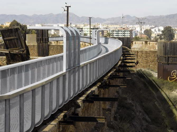 Siguiendo la topografía artificial, generada para llevar los trenes hasta la cota donde se encuentran los silos de mineral, se construye el Puente del Hornillo como un tramo metálico para salvar la rambla existente. De esta forma se producía la conexión entre el embarcadero y la estación de Águilas. Actualmente, esta topografía se encuentra desmontada, en todo el tramo que va desde la estación hasta el puente, para crear una calle paralela a la rambla. Esta nueva situación rompe el recorrido y presenta el puente como un objeto exento que no conecta con nada.