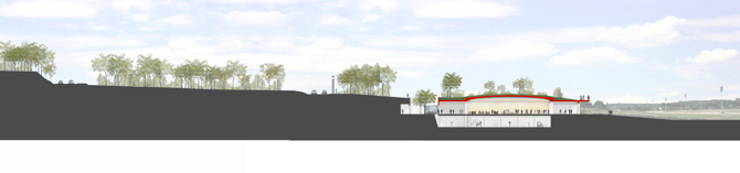 - Conservar los ensilladeros en la posición original, concentrando a su alrededor los servicios de carreras, jockeys, veterinaria, etc., en un edificio nuevo excavado en el terreno y abierto a jardines que aportan privacidad, iluminación y ventilación natural. Con accesos independientes y comunicación directa con el paddock y la tribuna central sin cruzarse con el público.