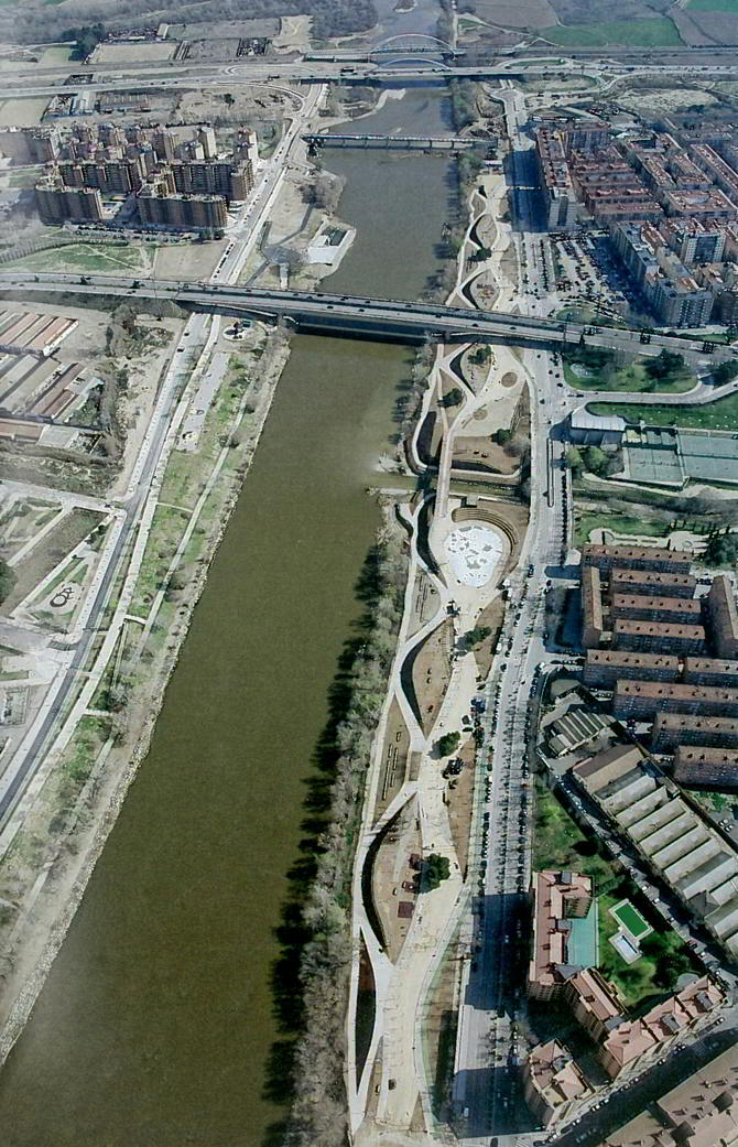 Pone en valor la característica visual longitudinal de este espacio hacia la basílica del Pilar, de tal modo que permite establecer la conexión visual del ámbito con el corazón de la ciudad, a través de uno de sus principales símbolos. Permite la máxima accesibilidad del ciudadano a la cota de lámina de agua mediante una estrategia de manipulación topográfica del talud actual, a través de la redistribución de tierras procedentes del ámbito de actuación.