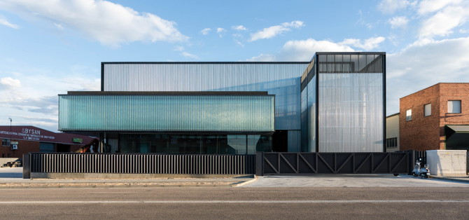 Iluminar de manera natural, sin deslumbrar, aprovechando las orientaciones y las sombras; en un entorno anodino, anónimo, jalonado de construcciones sin arquitectura, que podría ser la foto fija de cualquier polígono situado en el extrarradio de una ciudad de tamaño medio-grande. No podía faltar a esta cita con la luz la concepción de las oficinas. Recortándose sobre el fondo de la nave, se sitúan al frente, a pie de calle, accesibles tras la apertura de sendas cercha-puerta. La piel de cristal es transparente en planta baja, protegida por el cuerpo volado de la primera planta, que aun siendo también de cristal se refugia de las miradas; imaginándose pesado a partir del muro cortina de “U” glass y vidrio térmico. La cámara existente entre ellos ayuda a disipar y controlar la temperatura.