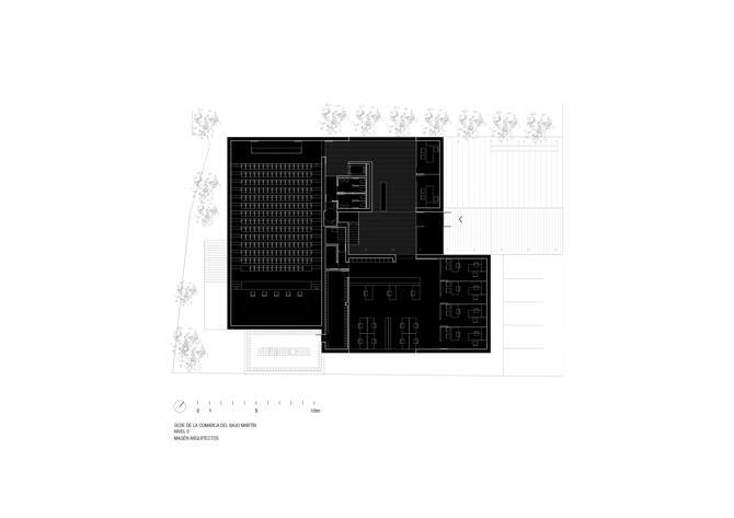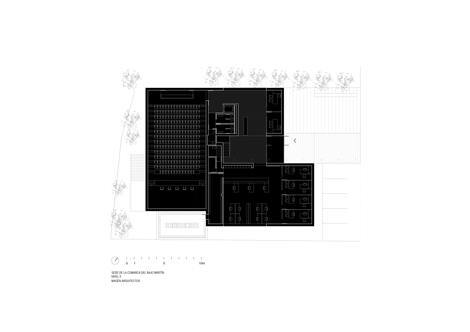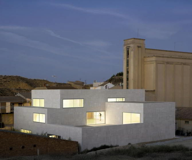 El volumen exterior, sólido y masivo, es vaciado en su interior. El comienzo del proyecto está en la definición geométrica y material de su volumetría, para después intervenir «excavando» en su interior un sistema dinámico de vacíos, conectados visual y espacialmente, en diagonal, relacionando las tres plantas y articulando los espacios de circulación, acceso y encuentro. Esta concatenación de los espacios estructura el vacío interior, pero mantiene su condición unitaria.