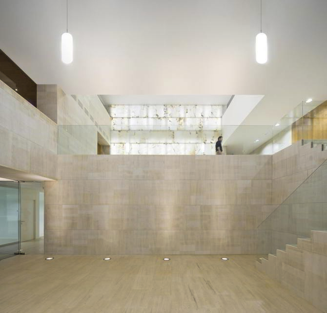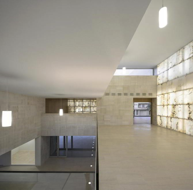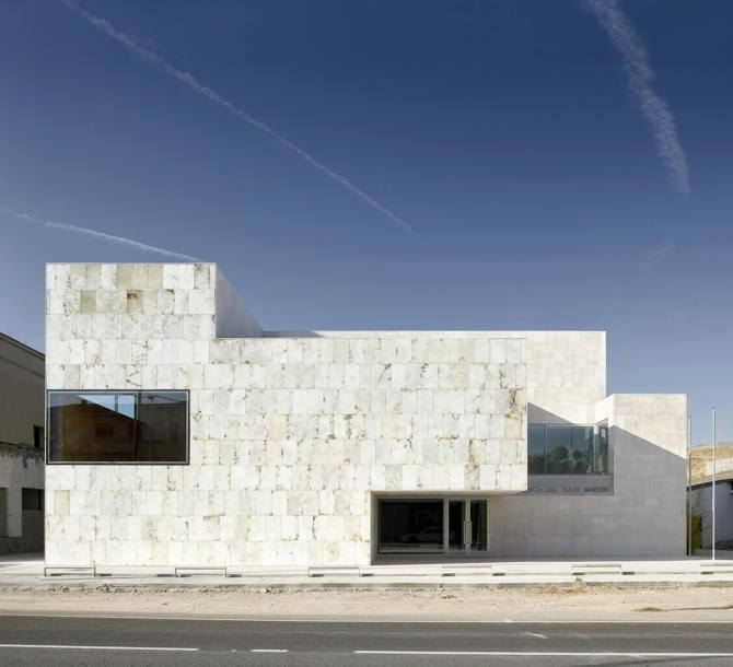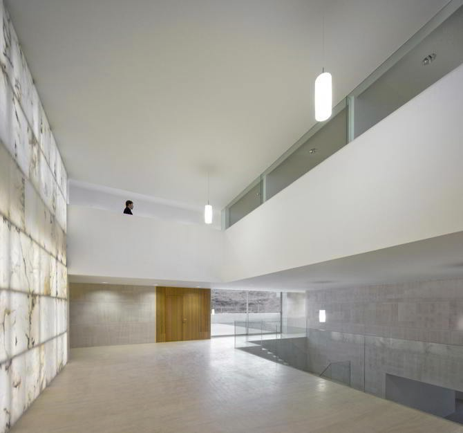 En este sentido, el alabastro y la piedra caliza que conforman los volúmenes maclados del edificio, tallados en distintos prismas, caracterizan su expresión formal y constituyen parte esencial del argumento del proyecto, evocando las superposiciones y descomposiciones volumétricas de las agrupaciones rocosas que se producen en las canteras de alabastro de la zona.