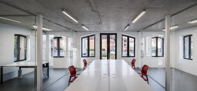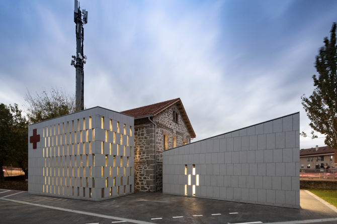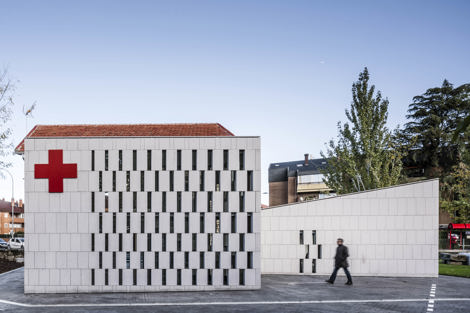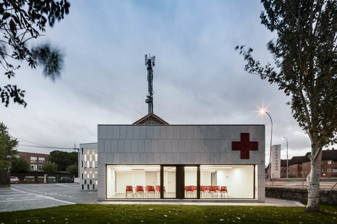 La sede de Cruz Roja en Galapagar (Madrid), al noroeste de la región, ocupaba un viejo edificio catalogado del patrimonio de principios del siglo XX cuya fachada principal está protegida, en una de las plazas con más visibilidad del municipio. El edificio, además de estar en mal estado de conservación, no cumplía con las mínimas condiciones de salubridad y de accesibilidad. Por este motivo, Cruz Roja decidió llevar a cabo una actuación integral de rehabilitación y ampliación, para adaptarse a las nuevas normativas y a las nuevas necesidades sociales. Para ello, se construyen dos nuevos volúmenes. El primero, para alojar las comunicaciones verticales del edificio y subsanar así los problemas de accesibilidad. Este nuevo cuerpo se dispone tras la fachada sur del volumen principal, no protegida, de forma que no interfiera con la percepción visual de la fachada principal. Y el segundo, para alojar dos aulas de formación, en contacto directo con el jardín situado en la esquina más alejada del tráfico, sustituyendo un viejo cobertizo metálico donde aparcaban las ambulancias, junto a la fachada este del edificio principal.