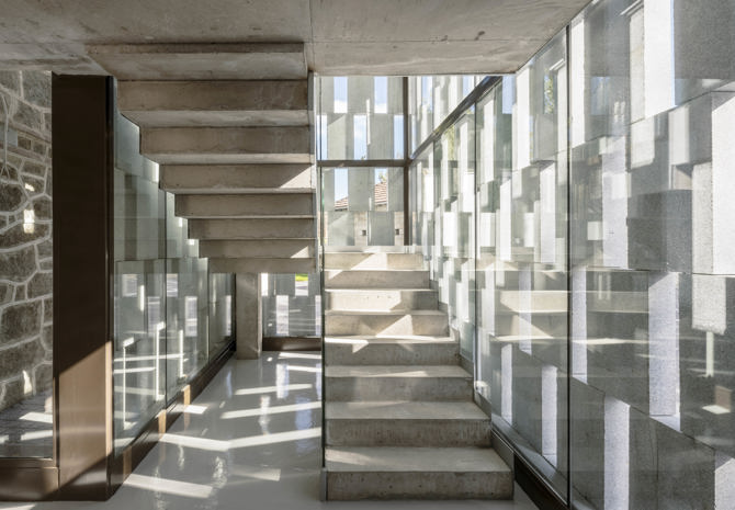 Nuestro proyecto establece como prioridad reparar las patologías detectadas y articular las nuevas construcciones con la existente. Para ello, los nuevos pabellones se separan y se conectan con el edificio existente mediante cuerpos muy ligeros, a modo de pequeños puentes de vidrio. Para distinguir las nuevas construcciones de la existente y conservar tanto su integridad como su valor histórico, se emplea el mismo material, pero con un sistema constructivo y un lenguaje contemporáneos, diferenciando el granito existente, empleado como muro portante, del nuevo granito, empleado como celosía y revestimiento, en fachadas y cubiertas.