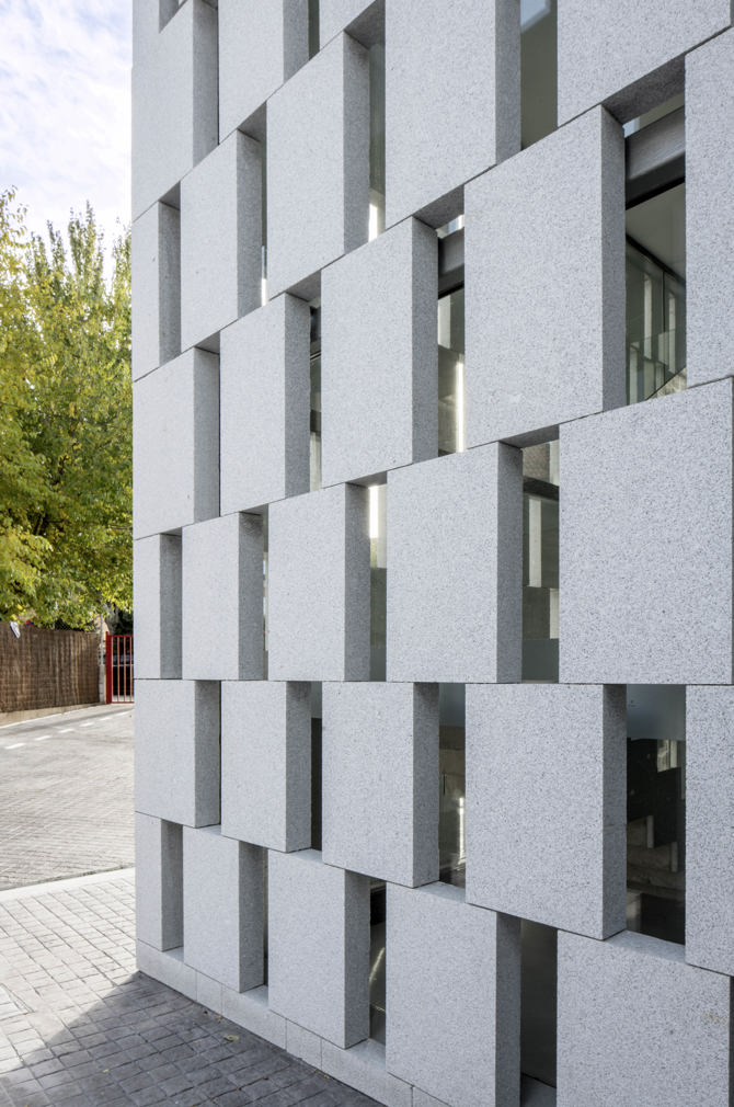El volumen de la escalera, orientado principalmente a sur, se protege con una celosía formada por piezas de 12 cm de espesor. Esta solución proporciona una eficaz protección solar, lo que contribuye a la eficiencia energética del conjunto. Esta misma solución se repite en los huecos del aulario, excepto en el frente hacia el jardín, que se abre por completo, para permitir su uso como aula al aire libre cuando el tiempo lo permite.