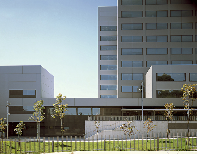 Estructura de hormigón, fachada de panel de aluminio colgado con junta abierta y carpintería de aluminio