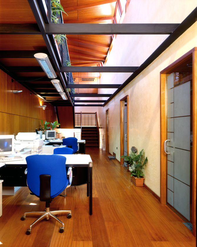 El nuevo edificio se caracteriza por una geometría irregular acorde con la disposición de la parcela y que en planta baja se abre también totalmente al gran espacio libre interior que se conserva. En este recinto se cuidó el ajardinamiento para que complementara los grandes árboles existentes. De acuerdo a ello las plantaciones se hicieron de una manera informal remendando las existentes en otros grandes patios cercanos. Con ello, se garantizaba el disfrute del espectáculo cambiante de las estaciones y la incidencia de la luz solar a aquellos usuarios de la empresa, clientes y trabajadores.