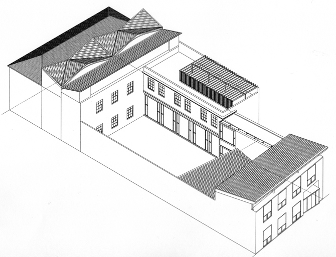 El conjunto enfatiza su condición escultórica, introduciéndose a la manera de elemento de distorsión dentro del nuevo espacio interior principal. El ala lateral construida a principios de siglo se mantiene en su estado original aunque se apea en planta baja debido al mal estado de la estructura existente, lo cual permite además la organización abierta y flexible de la oficina de contabilidad. La inserción de la nueva fachada que se propone en el callejón del convento de las Clarisas pretende ser sumamente respetuosa con su entorno y recupera la idea del espesor de muro existente en los edificios tradicionales de la ciudad histórica, así como la concepción unitaria del plano de fachada.