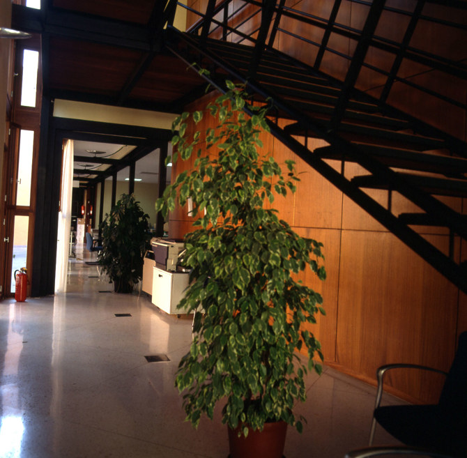 En contraposición, el edificio que se propuso trató de rematar esa forma tradicional de crecimiento de la edificación siguiendo los sistemas tipológicos presentes en la ciudad. Era fundamental, en este sentido, el mantenimiento del patio trasero existente, conservando su jardín y los árboles de porte presentes, tanto un nogal como un castaño. En una primera fase, el programa a desarrollar consistía en la dotación de espacios para la atención a los clientes de la empresa y un pequeño laboratorio de reconocimiento de aguas, así como la ubicación provisional de las secciones de contabilidad, servicios técnicos y dirección de la empresa.