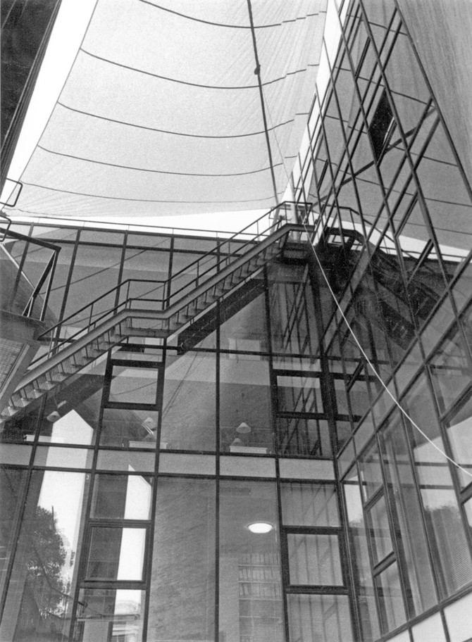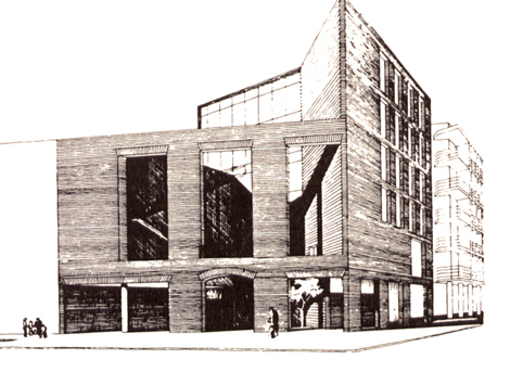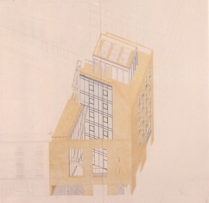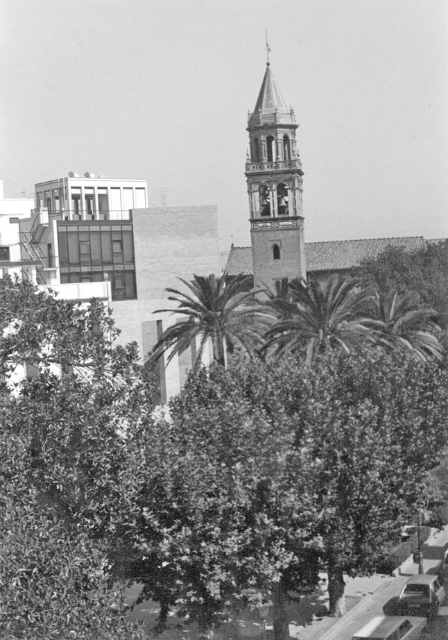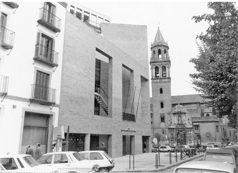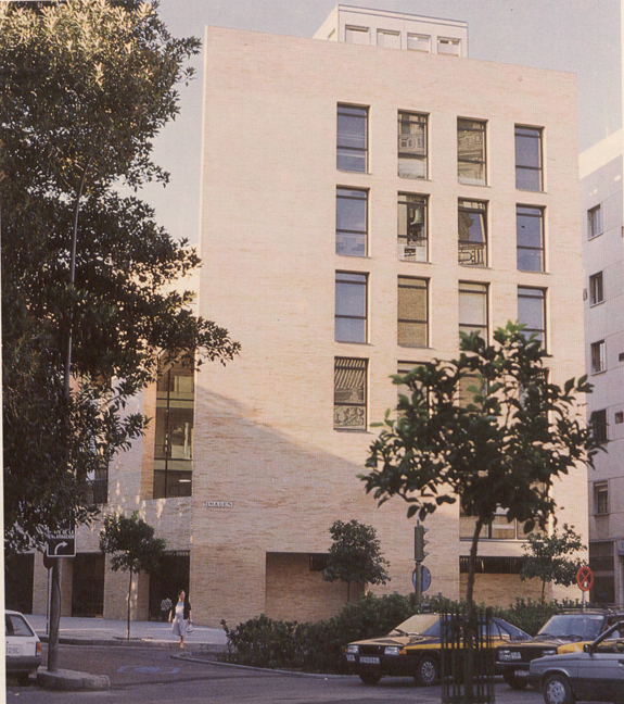 El solar del concurso y el contiguo, ahora aparcamiento, refuerzan la desolación de este punto. Es, pues, muy importante que el edificio que se construya mantenga el carácter de la plaza del Cristo de Burgos y al propio tiempo construya un decidido frente ante la calle Imagen y su tráfico. Habrá de ser charnela entre las cuatro alturas y los jardines de un lado y los coches y los seis pisos de otro. En este análisis del entorno urbano y de la obligatoriedad de no construir en un 25% de la superficie del solar, surge nuestra propuesta. Tomamos la diagonal del solar como frontera ideal entre las seis y cuatro alturas. Aparece así, retóricamente, la esquina frente a las calles Almirante, Apocada y Dona María Coronel. Contra este macizo se protege un patio abierto a fachada, cuya valla se alza simbólicamente hasta la altura de cuatro pisos. Tanto en esta fachada como en las demás se toma de la tradición sevillana las grandes dimensiones de sus huecos.