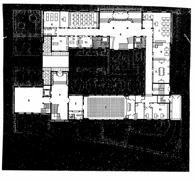 Se adopta la planta cerrada dejando un amplio patio central ajardinado, con un cuerpo saliente a la calle Joaquín Costa, junto al cual se produce el acceso principal a través de un pequeño jardín. El acceso del personal se realiza por el Paseo de la Castellana mediante un amplio vestíbulo en dos niveles que comunica con el patio interior.