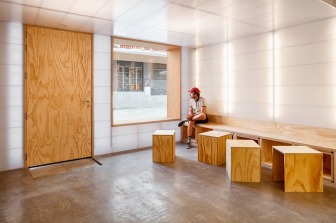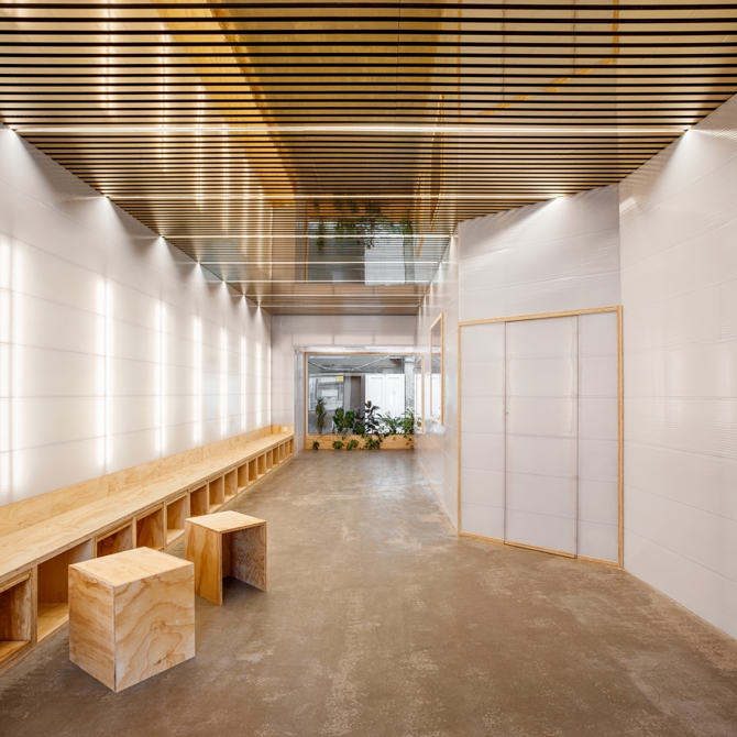 El proyecto se concibe desde la captación máxima de luz natural y la gestión de esta a través de los espacios interiores, creando un juego de luces, transparencias y reflejos. Todo el espacio se ha modulado según las placas de policarbonato celular de 33 cm de ancho y 6 m de largo, adaptando a dicha modulación todos los elementos constructivos, de mobiliario e iluminación natural y artificial. La naturaleza translúcida del material permite que las paredes y los techos puedan ser retroiluminados.