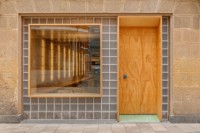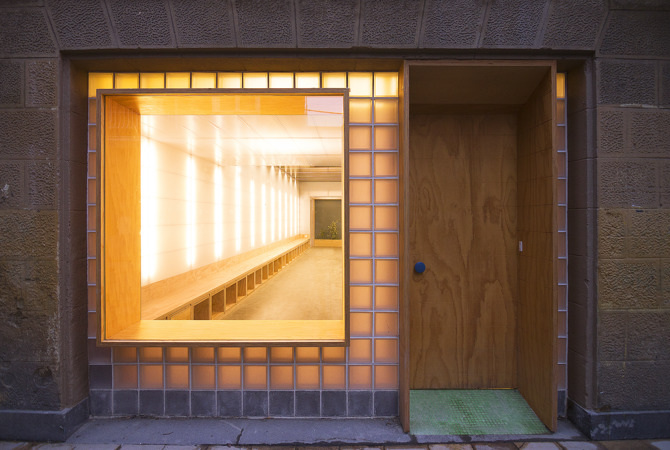 El carácter reflectante del techo hace que se desdibujen los límites, aumentando la sensación espacial y bañando el interior con el reflejo de la luz exterior. La fachada pública, terminada en bloques de vidrio, potencia la captación de luz natural y genera el efecto contrario de noche, creando un efecto linterna y dotando al local de un carácter propio dentro de la trama urbana.