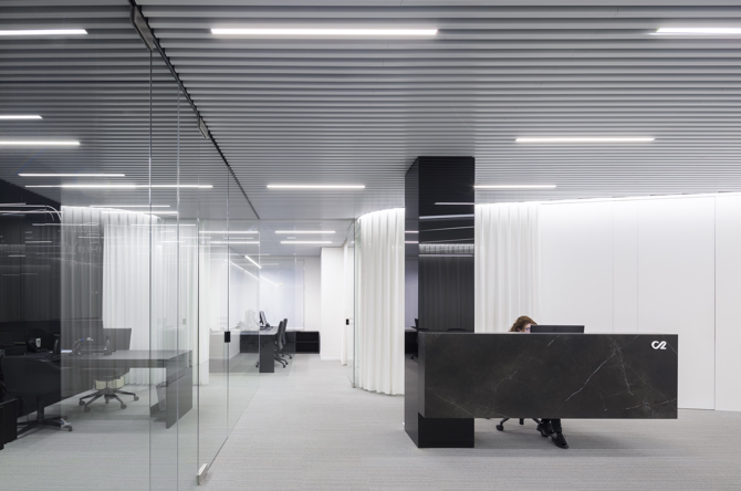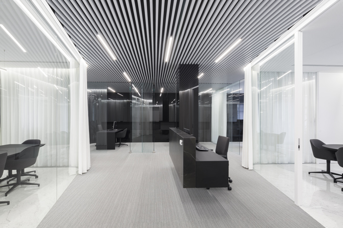 La dualidad de pretensiones de la propiedad, el deseo de contar con una gran área diáfana, sesgado por la necesidad de obtener privacidad durante las reuniones mantenidas con los clientes, nos lleva a explorar el tratamiento de los límites y la fluidez del espacio. La elección de materiales de diferente textura, dureza y reflejo, permite difuminar la percepción de final, ampliando visualmente la modesta superficie de la que se dispone.