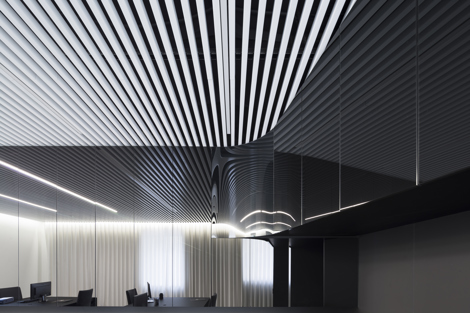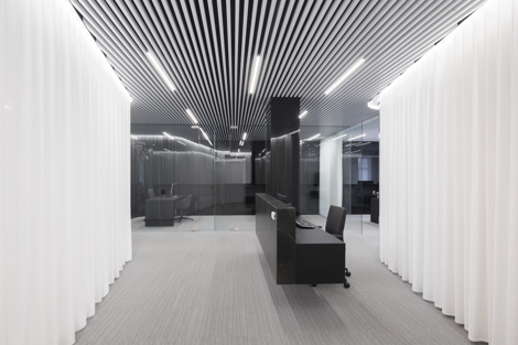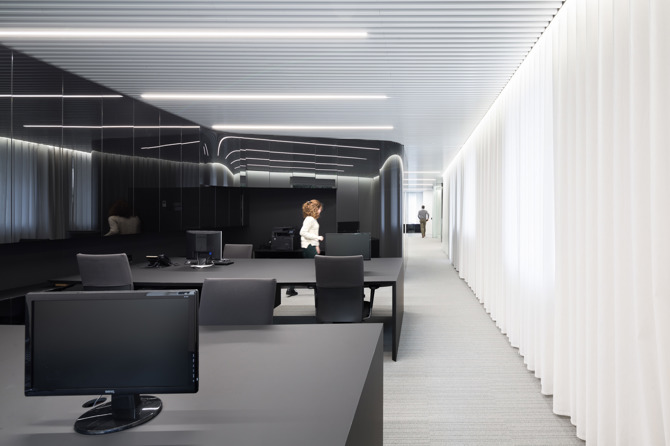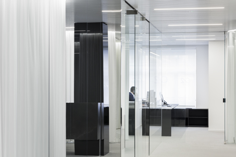 El vidrio negro encierra el amplio archivo requerido y las zonas de servicio. Las cortinas recogen y difunden la luz proveniente de los huecos existentes, de disposición caótica, homogeneizándola. A pesar de la monotonía cromática, el equilibrio obtenido mediante la dureza del vidrio y la tersura de la luz difuminada consiguen crear una atmósfera confortable.