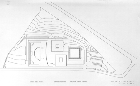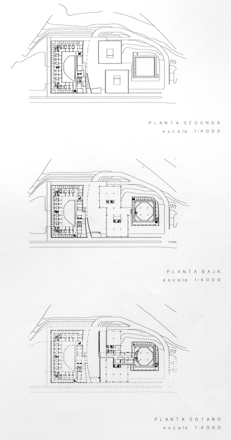 Entendíamos que se planteaba fundamentalmente un problema de adición. Por ello se proyectó una cuarta pieza, de dimensiones mucho más grandes que las de las existentes, y cuya posición y forma venían sugeridas por las de ellas: una gran caja de nítida geometría prolonga las alineaciones que las fachadas de las piezas originales establecían. La caja cierra el conjunto con tres de sus fachadas. La cuarta, la que se opone a la edificación existente, se curva creando un gesto que pretende abrazar, sujetar, los tres pequeños edificios originales.