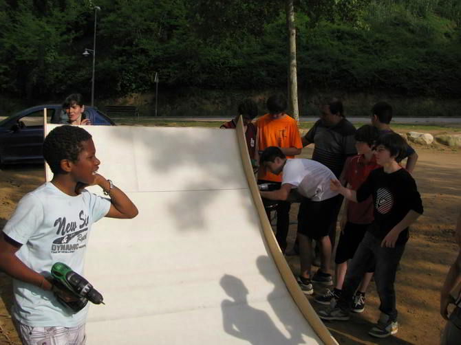 Desde el inicio, los jóvenes insistieron en que la pista debía realizarse en hormigón, pese a las limitaciones presupuestarias y la falta de experiencia técnica. A partir de talleres de carpintería y construcción, aprendieron a fabricar los encofrados y a manipular el material, construyendo ellos mismos las rampas, los muros y las superficies de patinaje. La pista, de planta trapezoidal, se adaptó al terreno y respetó la vegetación existente, incorporando elementos reciclados como vallas “New Jersey” convertidas en bancos, farolas cedidas por el Museo Picasso de Barcelona y un contenedor marítimo reutilizado como almacén, mirador y espacio social. Todo ello dio forma a un skatepark único, que combina infraestructuras deportivas con estrategias de reciclaje y autogestión, transformando un espacio residual en un punto de encuentro comunitario.