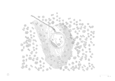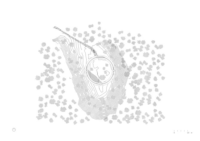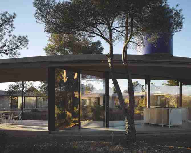 Se levanta en medio de un bosque natural, su planta circular enmarca el borde de una meseta que domina el paisaje. El suelo y la cubierta –dos losas anulares de hormigón de 4,5 m de ancho y 40 m de diámetro interior– definen la casa como un perímetro ampliado. El tejado se apoya en 4 estructuras de acero de 9 columnas. Colocados como cuerdas del círculo, describen colectivamente un cuadrado. Los 4 segmentos que definen son los únicos espacios cerrados de la casa. Tres de los 4 están cerrados por acristalamientos colocados dentro de los marcos de acero y arcos deslizantes de paneles curvos de policarbonato cubiertos con malla de aluminio estirado. Estos grandes tramos de fachada de cortina se deslizan en el borde exterior del círculo, permitiendo que las zonas de estar se abran completamente, y proporcionando una relación máxima entre el habitante y la naturaleza circundante. Todos los aparatos están montados directamente sobre las columnas. El cuarto segmento sirve de casa de la piscina, cuyo suelo retiene el agua de la cuenca inclinada dentro del patio interior.