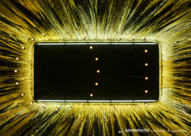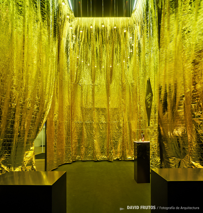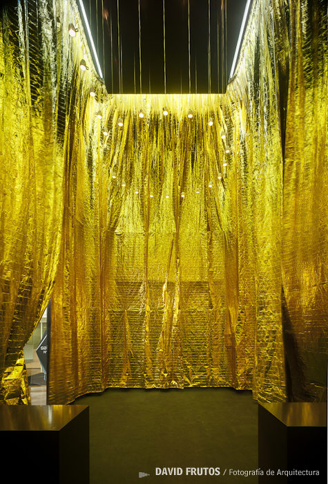 Desde los inicios del trabajo, llama nuestra atención la dualidad que se produce en el package tradicional en el que suele suministrarse el café en grano. Por lo general, suelen tratarse de envases cuyo exterior es aséptico y convencional, pero con un interior dorado que parece poner en valor el producto alimenticio. Nos planteamos entonces la posibilidad de entender el stand como un gran package donde exhibir en su interior el nuevo producto. Por ello, y con un bajísimo coste de ejecución, se construye un stand donde el ambiente exclusivo se consigue a través de los efectos lumínicos y múltiples reflejos generados por el material empleado, manta térmica de supervivencia. Aun no siendo estrictamente un material de construcción, se adaptaba perfectamente a nuestras necesidades, por lo que lo transformamos en una cortina de 8 metros de alto que envolvía la totalidad del espacio interior.