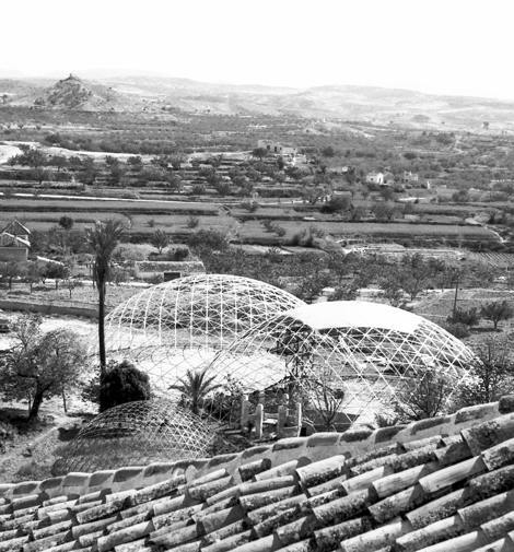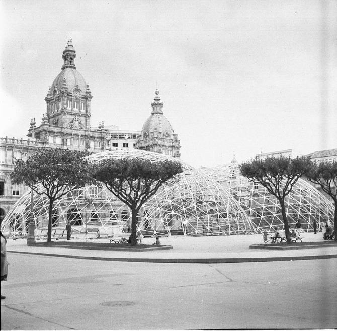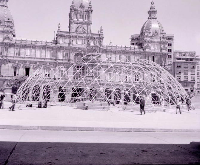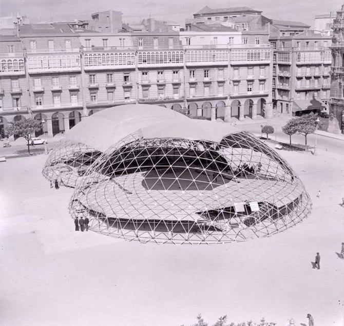 La misión del conjunto es albergar un teatro transportable de 1.800 butacas. Se trata de una yuxtaposición de dos cúpulas reticulares macladas. Dos casquetes de directriz esférica de 31 metros de diámetro y 11 metros de flecha; es decir, relación flecha/diámetro mayor de 1/3. Triangulación poliédrica de la directriz esférica y retícula de una sola capa, cuyo espesor en los nudos es de 6 milímetros.