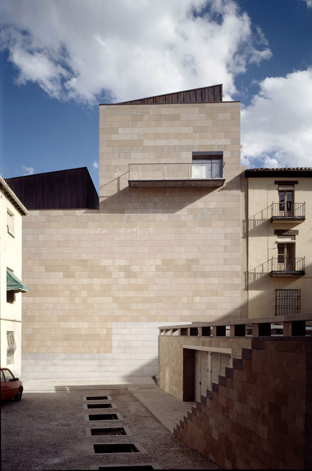 El sistema de cubiertas refleja la organización interna del edificio, destacándose, por su volumen, las correspondientes al patio de butacas y a la caja de escena. De su acabado exterior se han utilizado aplacados de granito en los zócalos y de piedra caliza en el resto.