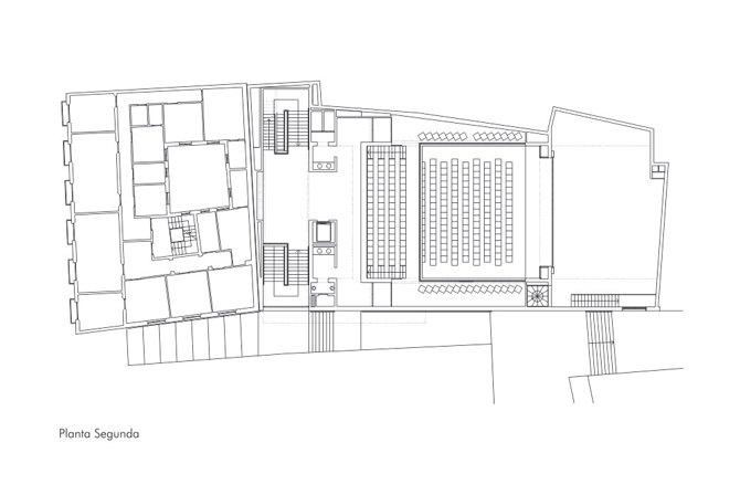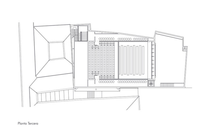 El interior presenta un aspecto sobrio y austero en las zonas de acceso que resalta la calidez y amabilidad de la Sala, concebida como una caja de madera.