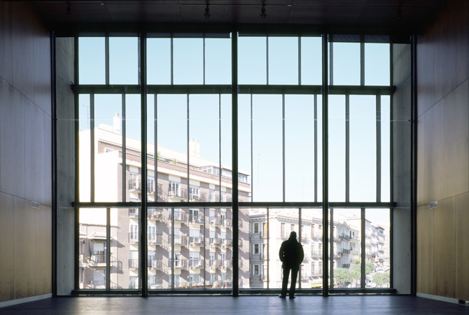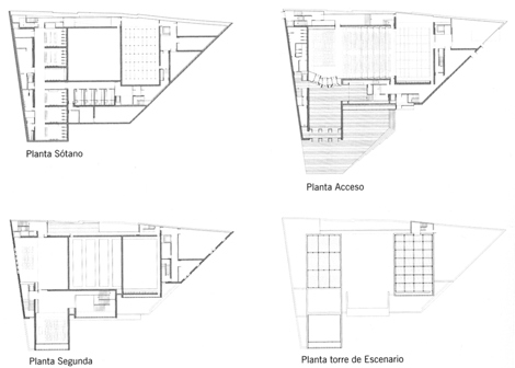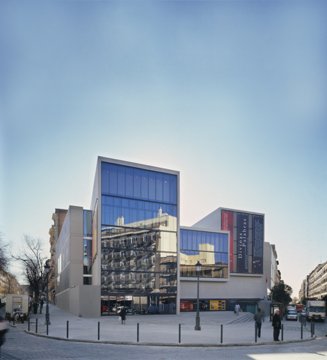 El teatro construye un vértice de la plaza de Lavapiés. Los volúmenes de hormigón en los que se fragmenta el edifico, con frentes acristalados transparentes hacia la plaza, se repliegan para ampliar el espacio público. En ellos se ordena un centro para teatro de vanguardia con dos salas de 500 y 200 plazas.