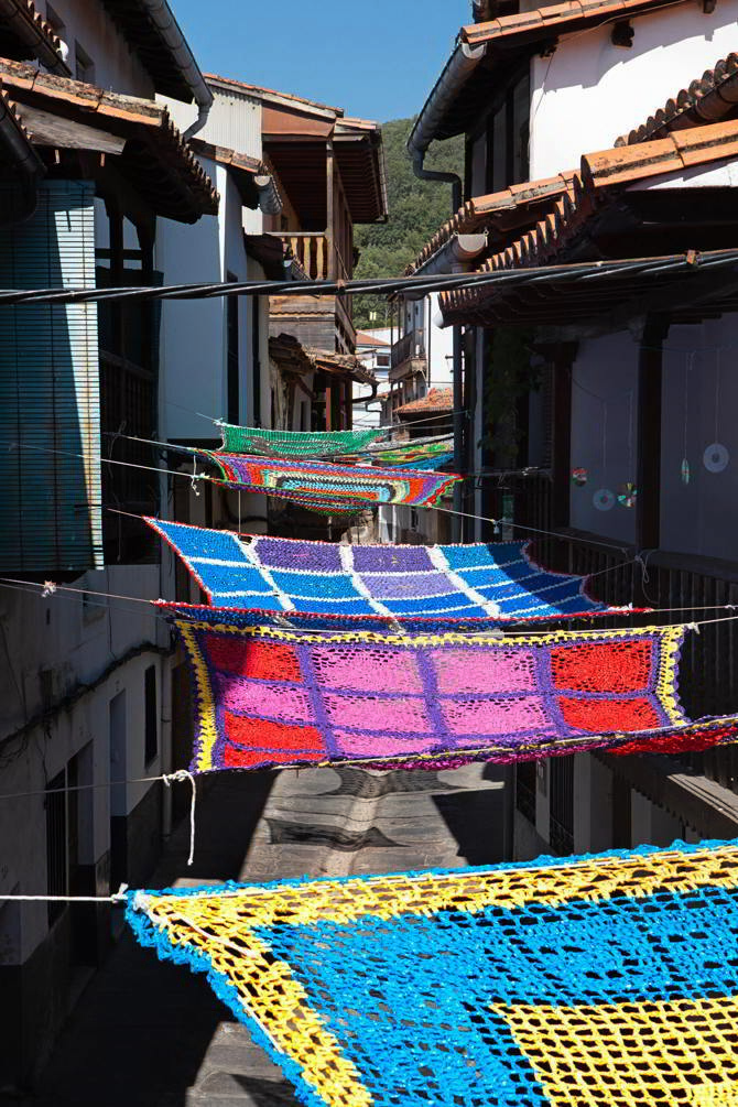 Motivos ornamentales, artes textiles, artesanía, ecología, quehaceres cotidianos, cooperación, urbanismo, paisaje y arquitectura, son algunos de los asuntos que intervienen en un proceso sostenido en el tiempo en el que las personas que lo llevamos a cabo compartimos nuestro afecto por el lugar que habitamos. La instalación artística de Tejiendo la calle cada verano viste, transforma y da sombra a las calles de un pequeño pueblo extremeño.