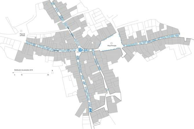 La instalación espacial es soporte de la expresión personal de las participantes en el proyecto y ayuda a visibilizar la identidad de nuestra comunidad rural. Acoge a los visitantes que llegan al municipio y colabora en la elaboración de un ambiente con espíritu celebrativo. Las piezas funcionan como protectores solares durante el día y llevan incorporada luz por la noche, acompañando el camino a la plaza.