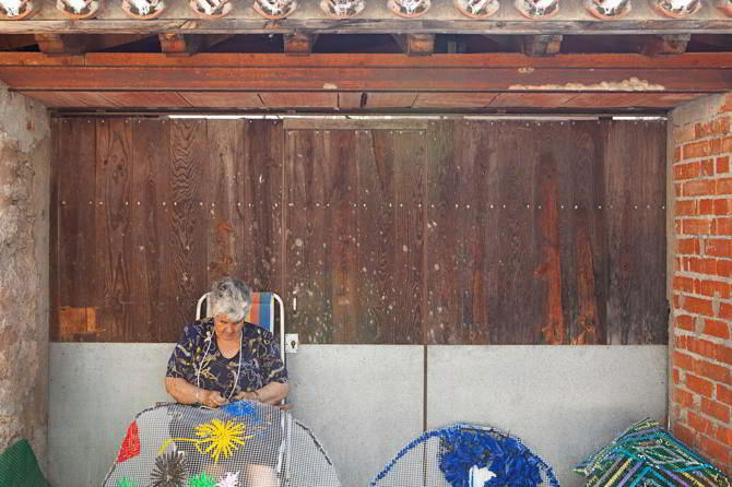 Para la elaboración de las piezas reutilizamos material plástico, tratando de alargar el ciclo de vida útil de este material contaminante, transformando deshechos en elementos bellos y funcionales. Hacemos acopio de bolsas de la compra y plásticos de embalajes que transformamos en largas tiras con las que preparamos ovillos para tejer. También tejemos con plásticos reciclados que adquirimos, de colores especiales y mayor resistencia para piezas singulares, y hacemos piezas con telas producidas a base de botellas PET recicladas. En 2022 reutilizamos lona plástica publicitaria gracias a la cesión del anuncio de la serie de «Lola» de Movistar+ que estuvo instalado en la Gran Vía de Madrid, a través del responsable de escenografía Jorge León. También incorporamos una nueva tipología de piezas en las que intervenimos redes de pesca en desuso que nos envía José Luís, marinero y tejedor de redes desde Pasajes, barrio pesquero de San Sebastián. Las piezas son ligeras, impermeables y se pueden almacenar ocupando poco espacio. Las volvemos a instalar en cada edición. Cuando se estropean por el uso y el impacto solar, hacemos talleres de reparación. Cuando ya no son recuperables, las depositamos en un punto limpio.