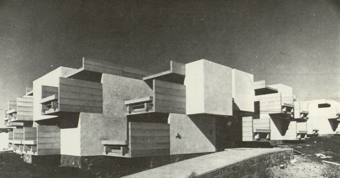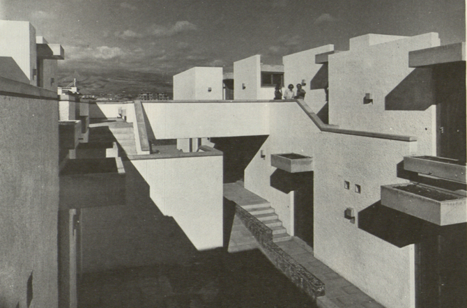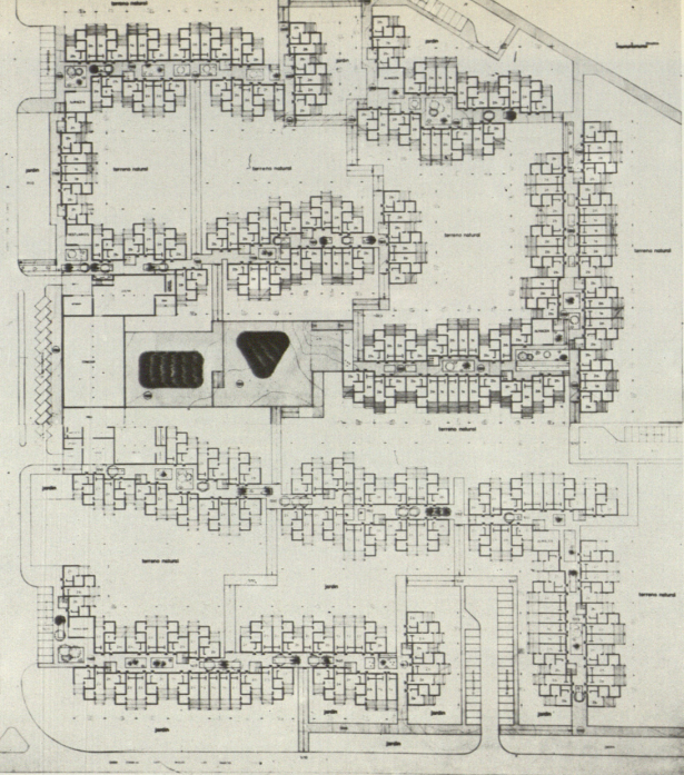 Los apartamentos se agruparon en pequeñas unidades en las que estaba resuelto el problema de la superposición de plantas diferentes. Adosando esas unidades se constituyeron cuerpos lineales. Se dispusieron estos cuerpos en líneas paralelas con los accesos hacia el espacio entre ellos. Con este elemento principal, y adaptándose a la topografía, se delimitaron amplios espacios interiores sobre los cuales se orientaban las terrazas. Estos espacios libres tienen una cierta variedad de caracteres: uno está ocupado por las piscinas, otros constituyen pequeñas plazas, y en los demás, se ha tratado de respetar la lava en su estado original.