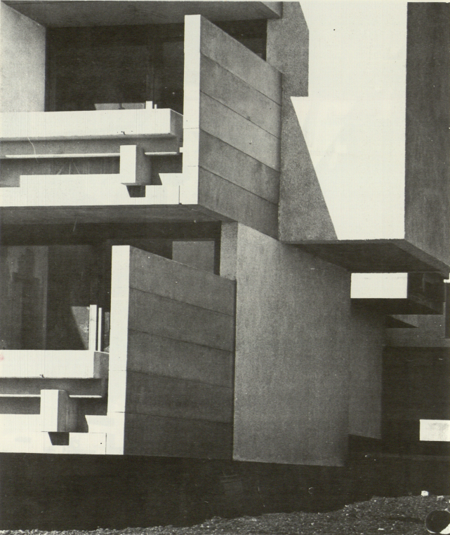 La estructura es de muros de carga revocados a la tirolesa pintados de blanco, y los forjados, jardineras, separación entre terrazas, escaleras, lámparas exteriores, etc. son de hormigón visto prefabricado.