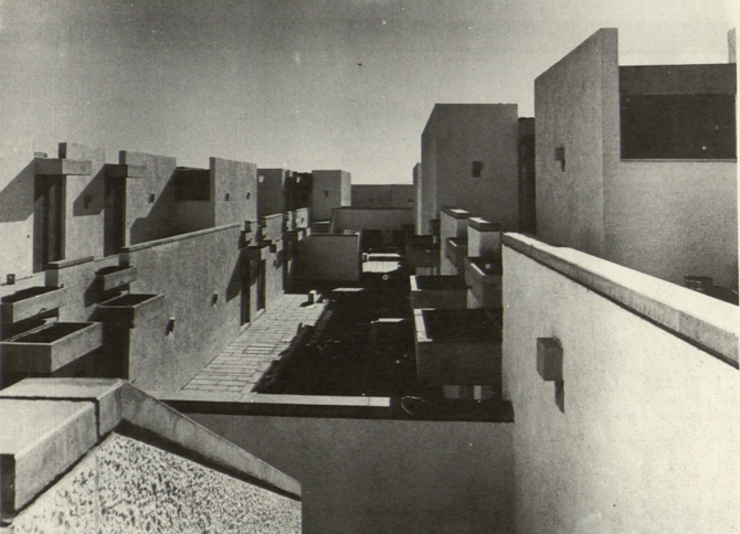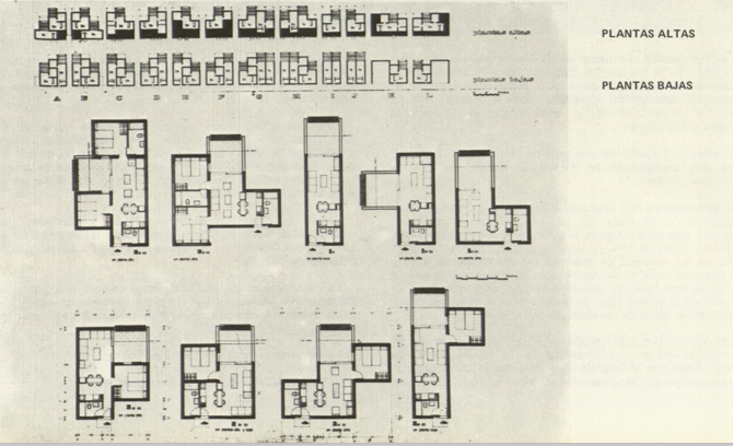 Se persiguieron dos objetivos específicos al proyectar esta agrupación, a la vista de las experiencias precedentes: conseguir una gran variedad a través de tratar la planta alta de forma diferente que la baja; y cuidar los aspectos de la escala de los espacios de acceso a los apartamentos.