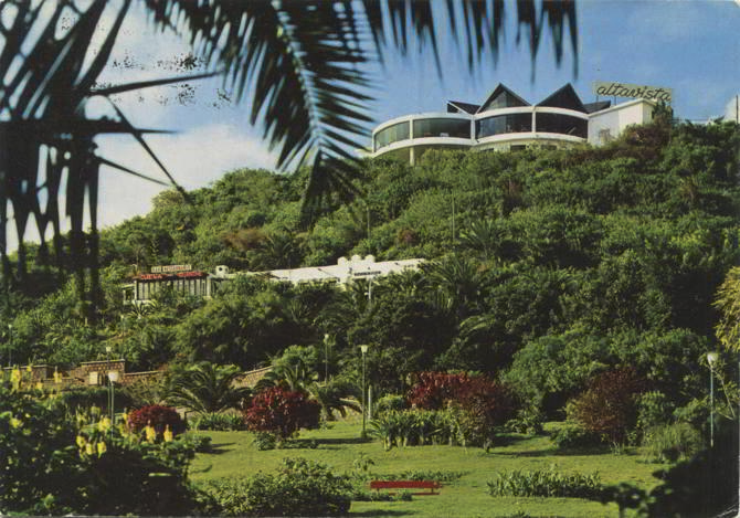 La costa de Punta del Hidalgo —como gran parte del territorio insular— ha visto cómo se reducía la superficie agrícola, desplazada por el crecimiento inmobiliario. Fincas de plátanos fueron sustituidas por hoteles y apartamentos. En ese suelo se levantaron construcciones como el Altagay, el Nautilus o el Neptuno, sede de la primera Escuela de Turismo. Estas arquitecturas, pensadas para capturar una imagen de prosperidad turística, son también vehículos de deseo: nos invitan a pensar cómo nos relacionamos con el paisaje que proponen. Sobre una silueta litoral de baja altura, destacan dos edificios que rompen esa lógica: el Hotel Océano y el Altagay. Dos volúmenes aislados que actúan como recordatorio de las transgresiones urbanísticas cometidas en la costa, con construcciones que hoy serían inasumibles desde el punto de vista urbanístico.