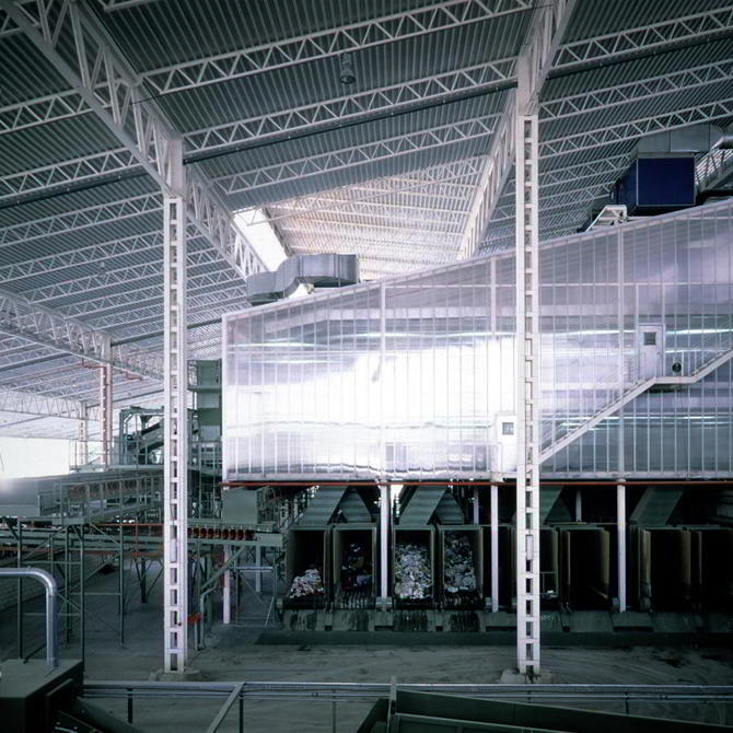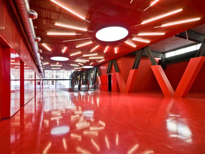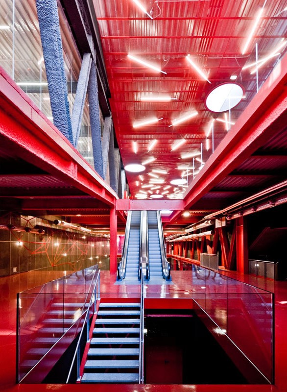 La configuración interior de la estructura de acero permite el máximo espacio y facilita la luz natural subterránea. Al estar enterradas las fachadas se reducen considerablemente, por lo que la expresión material se centra en la manifestación de la estructura y el color. El rojo intenso destaca la necesidad de energía y contribuye a la fluidez de las actividades. Las superficies principales de la plaza son de granito, fundiéndose con las calles circundantes también de granito, y reforzando su integración y mimetización con el centro histórico.