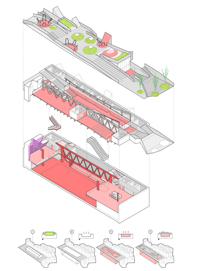 Los visitantes se instalarán en esta superficie que se convierte en una plaza pública y bajarán entre los estratos, entreteniéndose con actividades de encuentro, diversión y deporte. Las nuevas actividades y su manifestación contemporánea ponen de manifiesto nuevas formas de diálogo urbano, especialmente en una ciudad donde la historia ha ocupado un espacio tan importante. Es en el descubrimiento de nuevas posibilidades de expresión y en una atrevida apropiación de las mismas donde consideramos que radica su potencial.