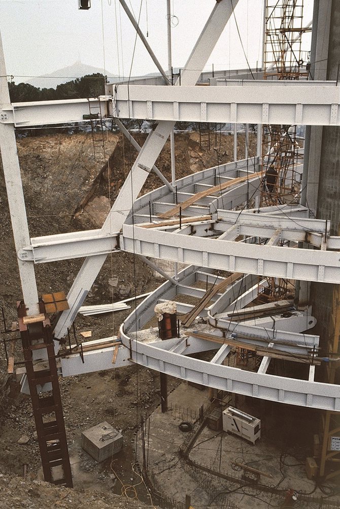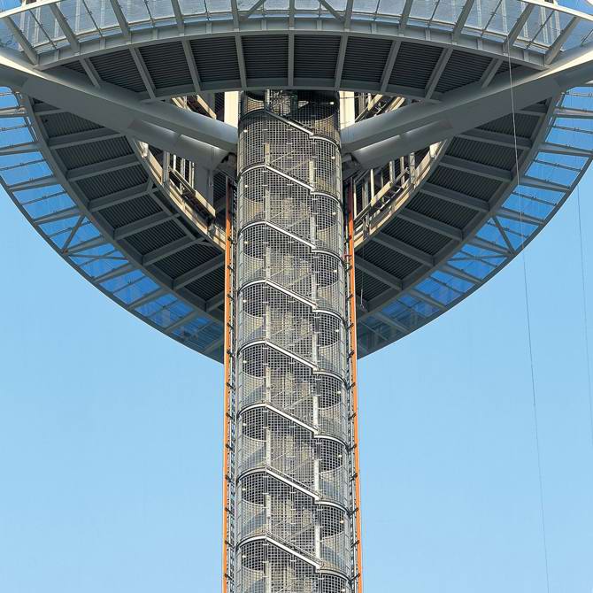 Una torre convencional de hormigón armado habría requerido un eje con una base de 25 metros de diámetro para alcanzar la altura requerida de 288 metros. Tras un análisis de precedentes, incluidos puentes colgantes y técnicas de construcción naval, surgió un concepto estructural completamente nuevo: un tubo híbrido de hormigón y acero, con un diámetro de base de solo 4,5 metros, que minimiza el impacto de las torres en la ladera de la montaña.