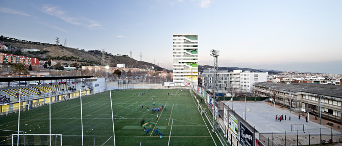 El proyecto, ganador del Premi Ciutat de Barcelona d’Arquitectura i Urbanisme 2011, está situado en una parcela resultante de la construcción de la Ronda, donde coinciden un centro deportivo, una residencia y la Torre Júlia, un edificio de viviendas para gente mayor. Se genera a su alrededor un espacio público que se extiende desde la calle hasta definir una plaza que da acceso a los distintos equipamientos.