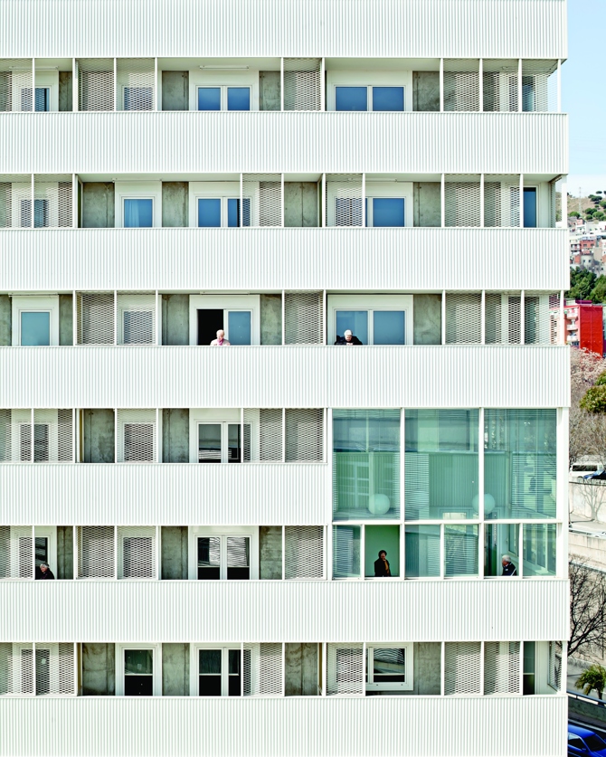 La Torre Júlia tiene un recorrido vertical de 17 plantas y se divide en tres comunidades apiladas con un espacio comunitario en cada una de ellas. Estos espacios constituyen el corazón de la propuesta y se expresan en fachada de una forma muy clara. Pasillos anchos como calles con vistas a la ciudad, escaleras recorriendo el exterior, dobles espacios y una cubierta soleada configuran un edificio pensado para que la gente mayor tenga la posibilidad de socializar y disfrutar de las actividades en comunidad.