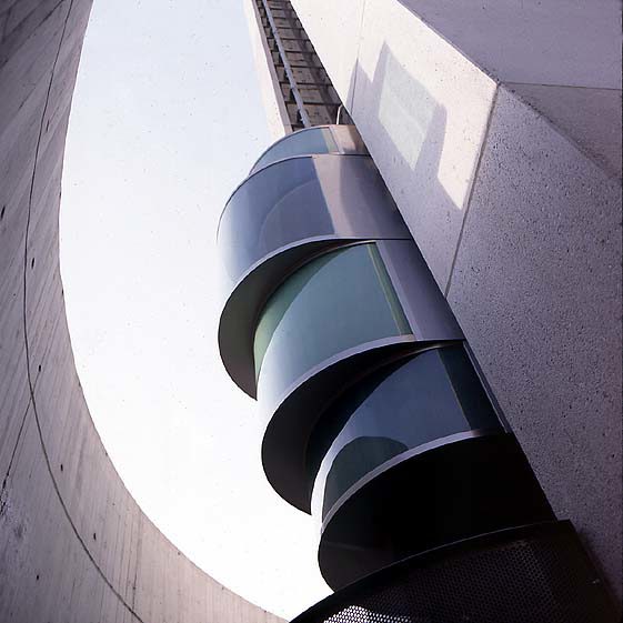 La composición cruciforme de la planta posibilita su construcción mediante cuatro prismas formados por elementos prefabricados de hormigón, que albergan los recorridos de los tres ascensores y la escalera, permitiendo conseguir la máxima esbeltez mediante la reducción al mínimo de la superficie en planta, y el logro de un fuste columnario complejo que posibilite un juego de luces, sombras y perspectivas diversas, subrayando dicha esbeltez. Este criterio se ve reforzado por la meditada formalización del principio y final del “hito”. Del principio en cuanto que el fuste columnario tiene su basa en la roca y surge de la misma a través de un foso circular que evita el contacto de aquél con el plano de rasante; pero también en cuanto al acceso, resuelto mediante el pórtico metálico que constituye la gran puerta que relaciona la cota de acceso a la planta baja con la cota de arranque de la escalera, a la que se accede mediante un puente metálico apoyado en una colina artificial, construida con las aportaciones resultantes de la excavación, necesaria para la construcción del foso.
