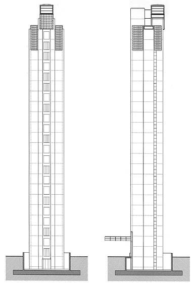 Este cambio de material, junto con los cambios que se producen en la geometría del perímetro de las plantas de máquinas y del mirador respecto al resto del fuste, confieren un remate adecuado a la torre.