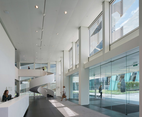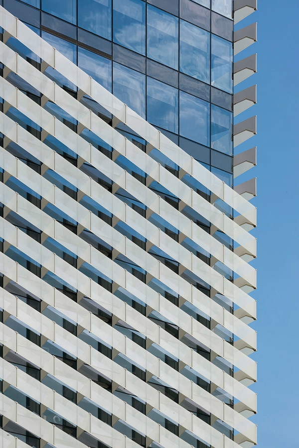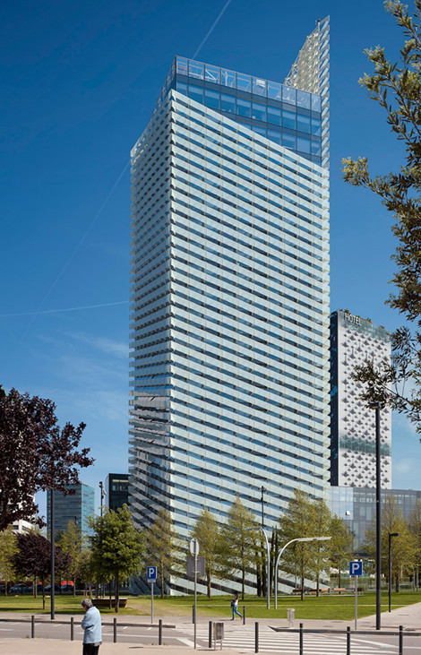 La torre respeta estrictamente la planta y la altura establecidas en el planeamiento y su interés reside en la espiral vítrea que envuelve el volumen. Se elimina así cualquier tentación de entender la torre como superposición de planos horizontales, reforzando su carácter unitario. La banda vítrea contribuye a dotar a los espacios interiores de un atractivo filtro que ayuda a mejorar, por otra parte, las condiciones de aislamiento del edificio.