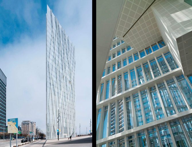 El proyecto toma esta condición múltiple como una oportunidad para generar una torre contextual que es a la vez un hito y un espacio público, tomando las alineaciones del perímetro del solar como generatrices del edificio. Es un prisma trapezoidal agudo y estilizado, una construcción blanquecina ligera y reverberante. Su transparencia revela los volúmenes interiores dinámicos y variados que responden a las diferentes especificidades del programa y que se relacionan con las diversas alturas de los edificios vecinos.