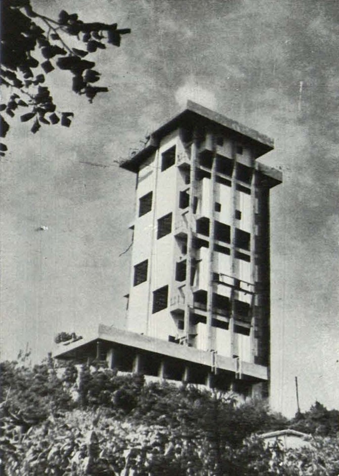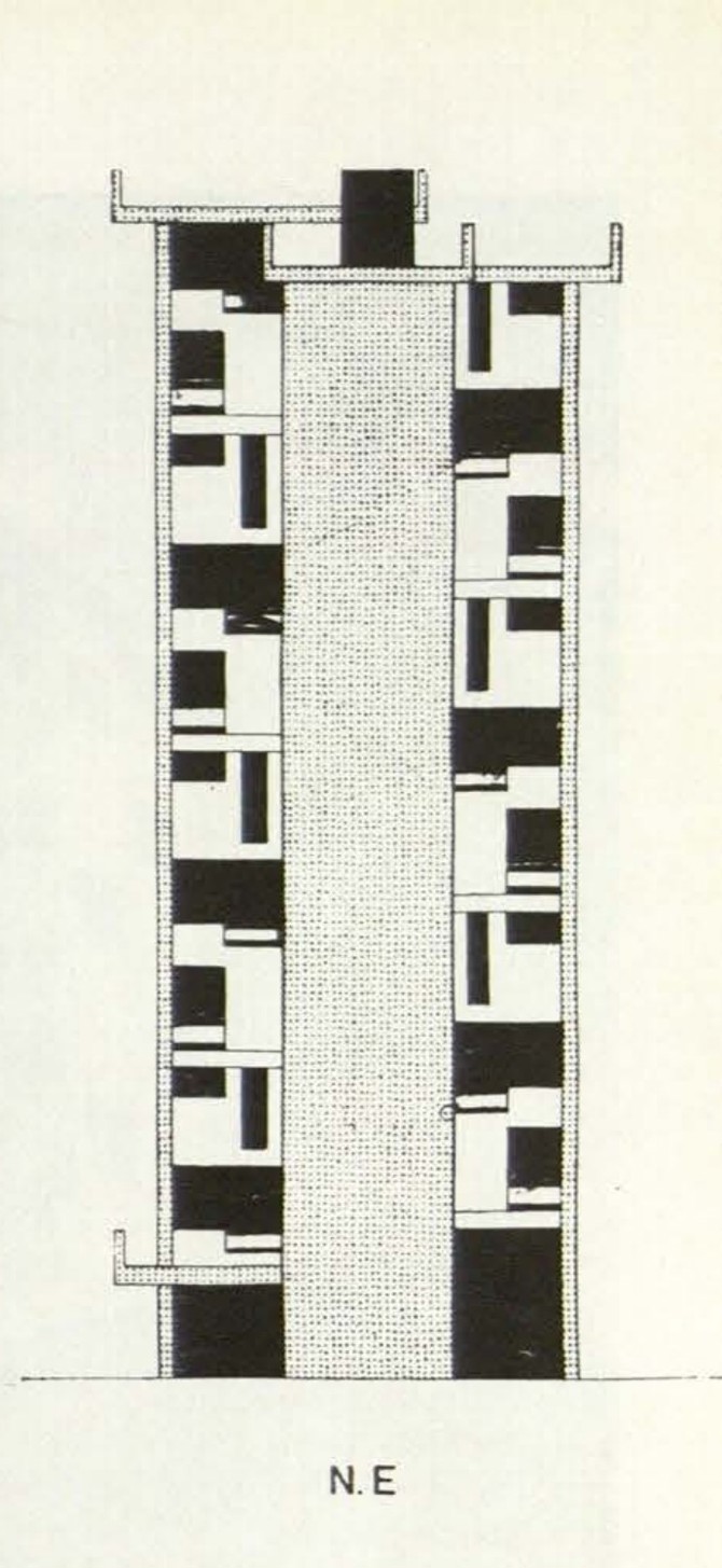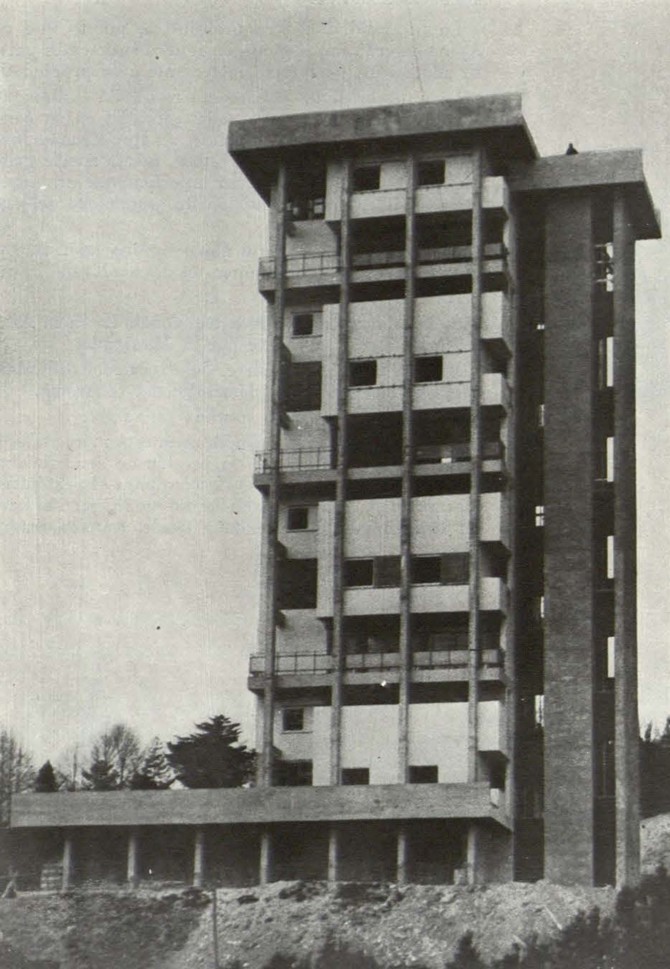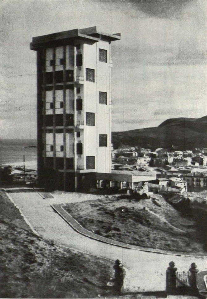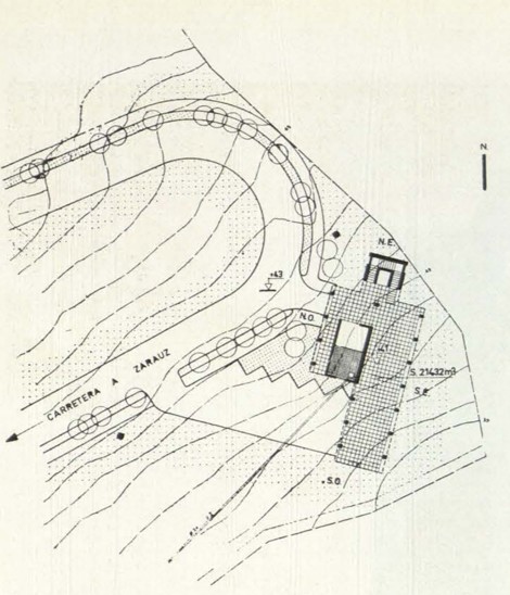 Un palacio en las proximidades de la costa vasca, rodeado de un gran parque –todo ello difícil de sostener en las condiciones sociales de hoy– está siendo transformado en barrio residencial. Condición primordial: respetar el magnífico arbolado. Esto ha llevado a una solución de bloques en altura con tres viviendas, cada una de las cuales se desarrolla, a su vez, en tres niveles distintos: una, para la zona de estar; otra para los dormitorios y la tercera para el servicio.
