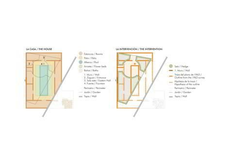 Esta intervención, en clave contemporánea, plantea reflexionar acerca de la traza como patrimonio, y poner el foco en elementos que están fuera de los principales circuitos del monumento. Se realiza con medios sencillos y efímeros con el fin de progresivamente desaparecer. Como una radiografía del subsuelo, visibiliza la existencia de los restos de la casa a escala 1:1 y recuerda el trazado histórico perdido, confrontándolo con la moderna disposición del jardín y la calle. A partir del resto material del muro, se dibujan en línea continua las partes de la traza descritas en el plano de 1963 y en línea discontinua la hipótesis del trazado del resto de esta estructura doméstica que diversos investigadores han desarrollado en sus estudios.