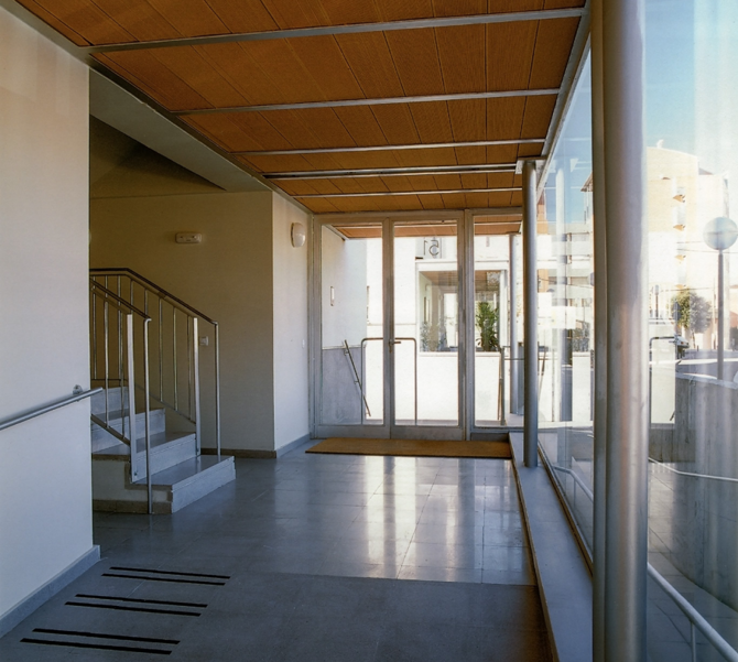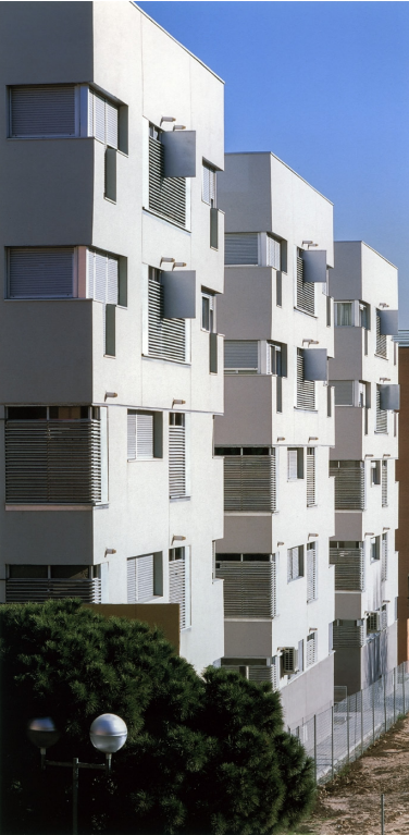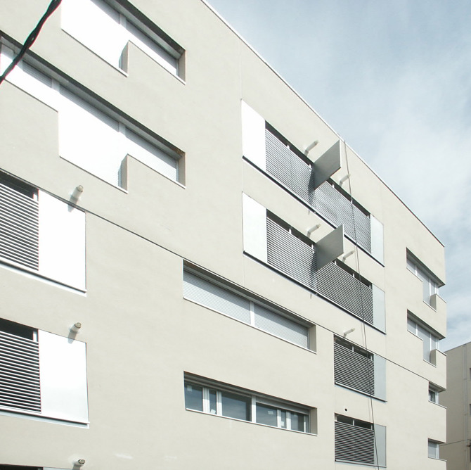 Las viviendas organizadas en torno al pasillo son indiferentes a la orientación. Los portales exentos respecto del prisma principal, con las ranuras que caligrafían el lienzo blanco de fachada, ponen de manifiesto la estricta pureza de las soluciones constructivas. La simplicidad de los volúmenes repetidos confieren a este proyecto un carácter conceptual particularmente próximo a soluciones sotianas no muy alejadas de este lugar. Quizá Wittgenstein también esté presente.